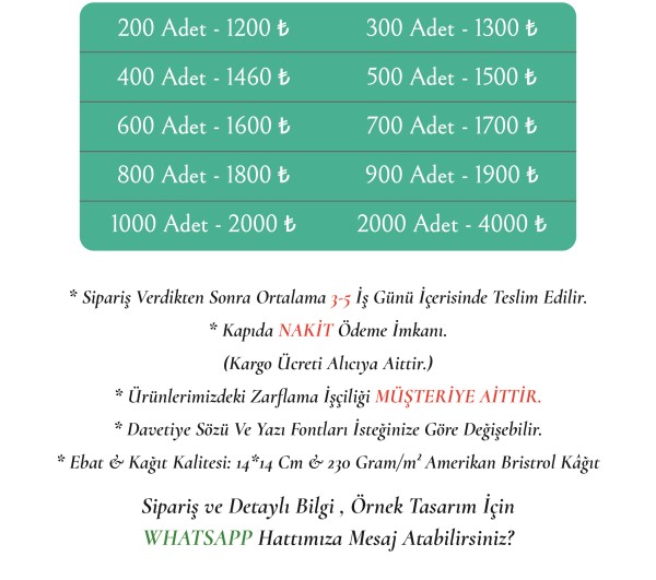 Göndermiş olduğunuz bilgilerle davetiyeniz tasarlanıp size tasarım Whatapp üzerinden gönderilecektir. Onayınız olmadan davetiyeniz baskıya verilmeyecektir.