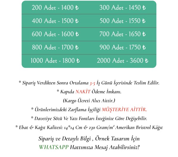 Göndermiş olduğunuz bilgilerle davetiyeniz tasarlanıp size tasarım Whatapp üzerinden gönderilecektir. Onayınız olmadan davetiyeniz baskıya verilmeyecektir.