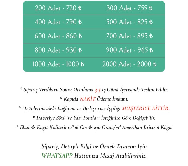 Göndermiş olduğunuz bilgilerle davetiyeniz tasarlanıp size tasarım Whatapp üzerinden gönderilecektir. Onayınız olmadan davetiyeniz baskıya verilmeyecektir.