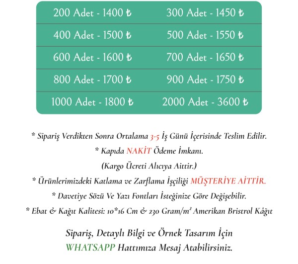 Göndermiş olduğunuz bilgilerle davetiyeniz tasarlanıp size tasarım Whatapp üzerinden gönderilecektir. Onayınız olmadan davetiyeniz baskıya verilmeyecektir.