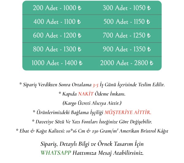 Göndermiş olduğunuz bilgilerle davetiyeniz tasarlanıp size tasarım Whatapp üzerinden gönderilecektir. Onayınız olmadan davetiyeniz baskıya verilmeyecektir.